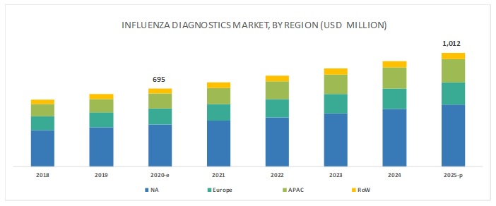 The global influenza diagnostics market is expected to grow from USD 695 million in 2020 to USD 1,012 million by 2025, at a CAGR of 7.8% during the forecast period. Influenza Diagnostics Market by Test type (Molecular (RT-PCR,LAMP, NASBA), Traditional (Viral Culture, Direct Fluorescent Antibody, Rapid Influenza Detection Tests, Serological Assays)), End user (Hospital, Clinical Laboratories) – Global Forecast to 2025