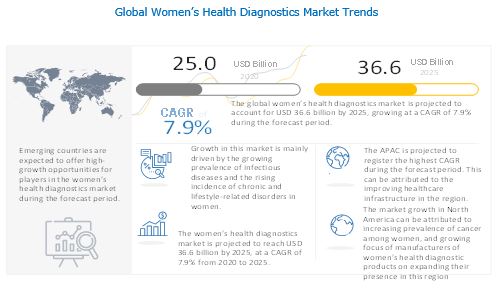The women’s health diagnostics market is projected to reach USD 36.6 billion by 2025 from USD 25.0 billion in 2020, at a CAGR of 7.9% during the forecast period.